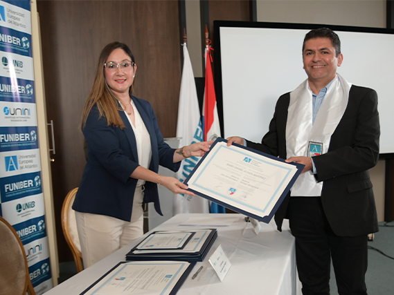 Les diplômés ont également reçu des messages de félicitations par vidéo de la part des plus hautes autorités académiques des universités du réseau. Sont intervenus le recteur de l’UNEATLANTICO en Espagne, le docteur Rubén Calderón ; le recteur de l’UNINI au Mexique, le docteur Luis Dzul ; et la rectrice de l’UNIB à Porto Rico, la docteur. Carol Morales, qui ont souligné l’importance de la formation continue et la portée internationale de ces programmes.